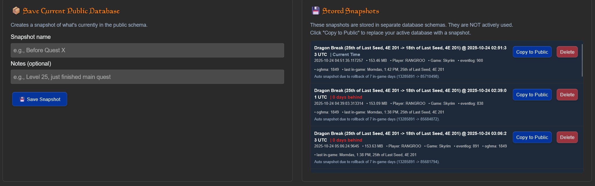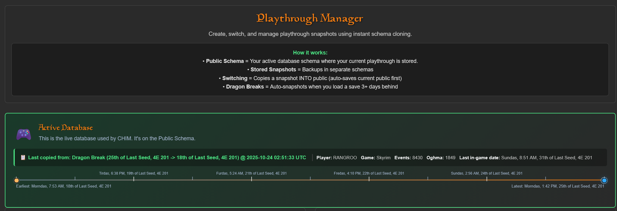 It is quite simple. When you load a save that is 3 ingame days in the past it will trigger a DragonBreak. This will automatically save a snapshot of the CHIM events and memories before deleting them.