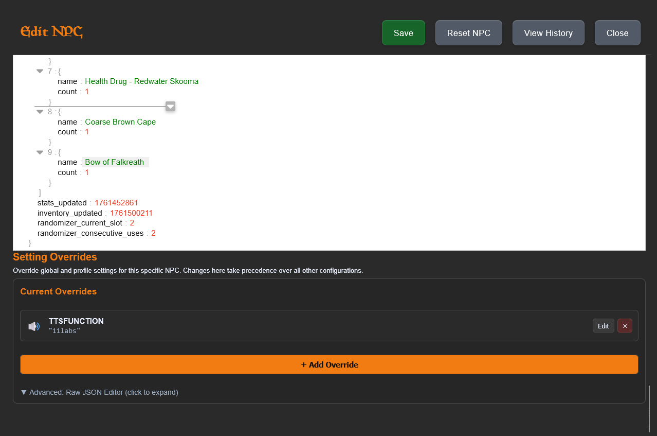 Voice ID’s for our recommended TTS services such as CHIM XTTS, MeloTTS, xVASynth etc are configured automatically whenever a profile for an NPC is created.
