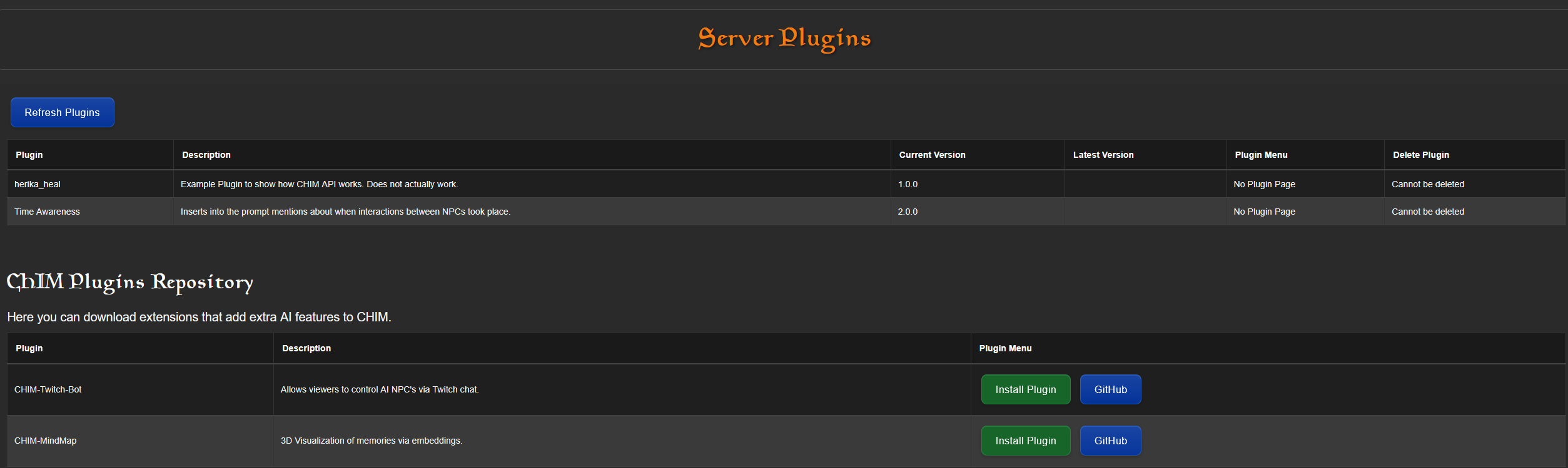 Plugins in CHIM allow you to integrate CHIM with other mods.