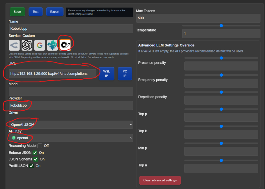 URL: Click PC IP, ensure port is :5001/api/v1/chat/completions