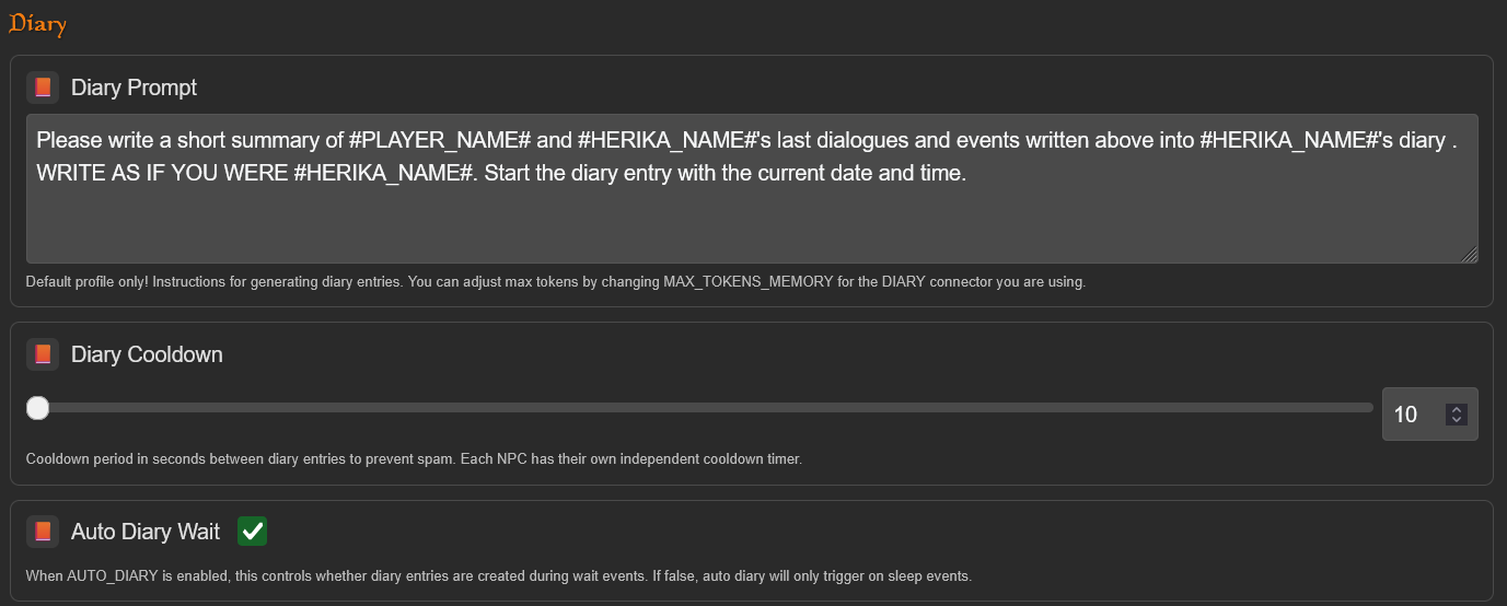 Each AI NPC will have their own diary. The purpose of this is to provide a roleplaying tool that can generate an after-action-report of your entire Skyrim playthrough!